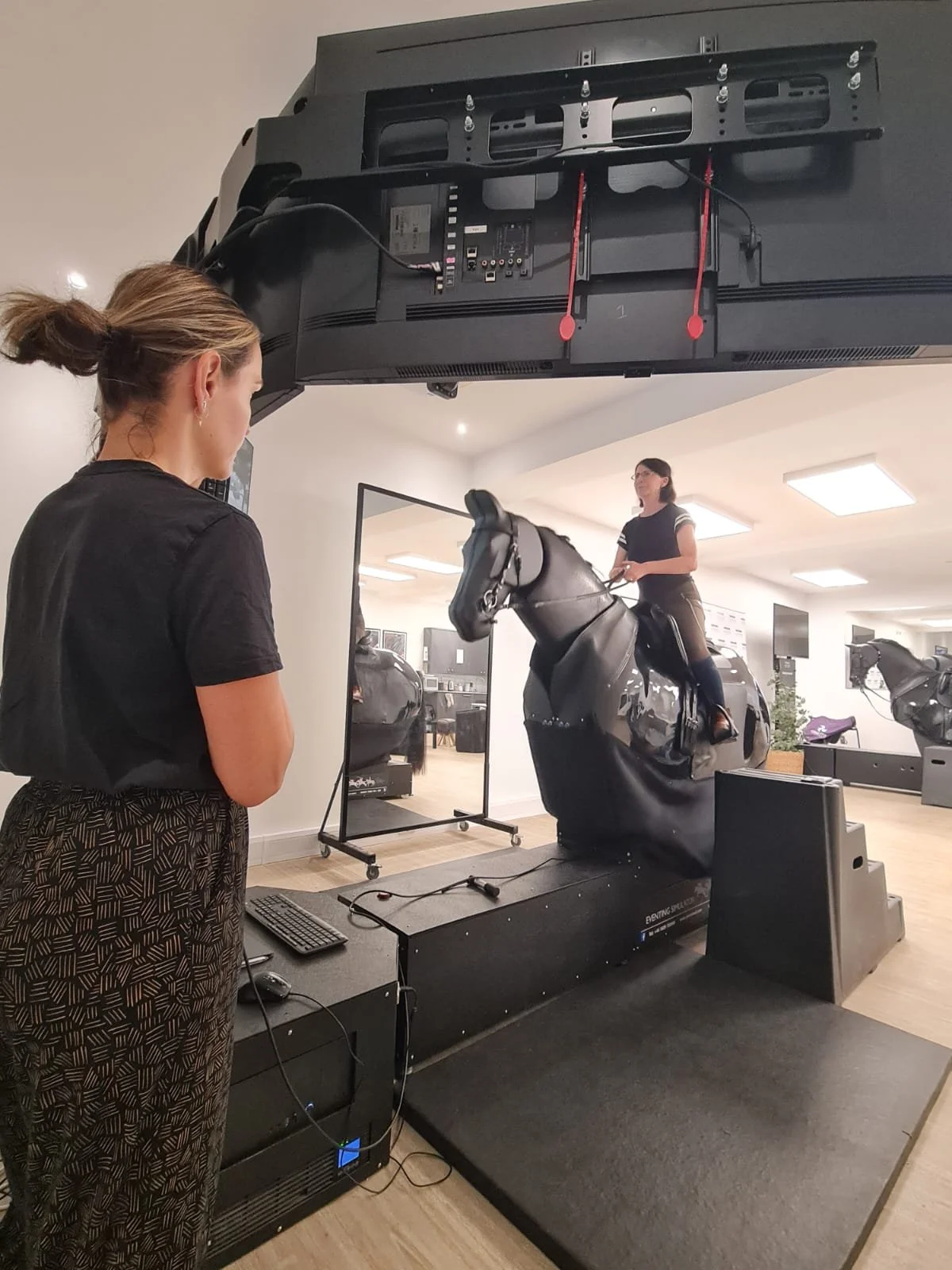Med hjälp av avancerad sensorteknik analyseras din sits i realtid. På skärmarna visas tydliga staplar och diagram som visar balans, position och inverkan, samtidigt som instruktören kan ge feedback och korrigera dig direkt – även i galopp och hoppning. Ett ovärderligt verktyg för att utveckla känsla och korrekt ridteknik.